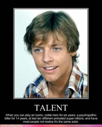 About a month ago I posted an article on why episode VII will be good. I made some good points in the article, but was remiss in mentioning one person: Mark Hamill. The fact is that Mark Hamill is a far better actor now than he was when he was first cast in the original Star Wars trilogy. When Hamill was originally cast, he had some acting experience on television in the form of a sit-com and the soap opera General Hospital. Star Wars was his first major film break, and he was cast in the lead as Luke Skywalker. That’s a lot of pressure on a relatively inexperienced actor, not to mention the fact that George Lucas is not known for his great ability to direct actors. So the performances that we got, while good, were probably not great. Since Return of the Jedi however, Hamill has expanded his acting to Broadway, and most famously to voice over work.