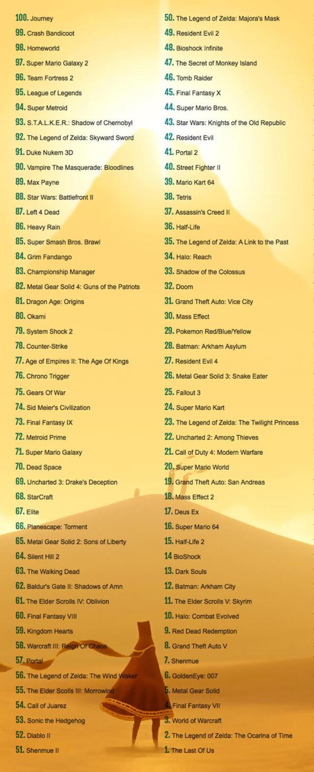 The good people at Empire Online have released a list of their 100 greatest games of all time. After reading this list I agree with much of it, but definitely have a bone to pick about some of their choices. For example: I would have placed Arkham City, Zelda: A Link to the Past, and Final Fantasy III (in America) in the top ten. That being said, they have done a pretty comprehensive job of ranking these games. You can view the full article which includes explanations for each game here; in the meantime, view the list for yourself below: