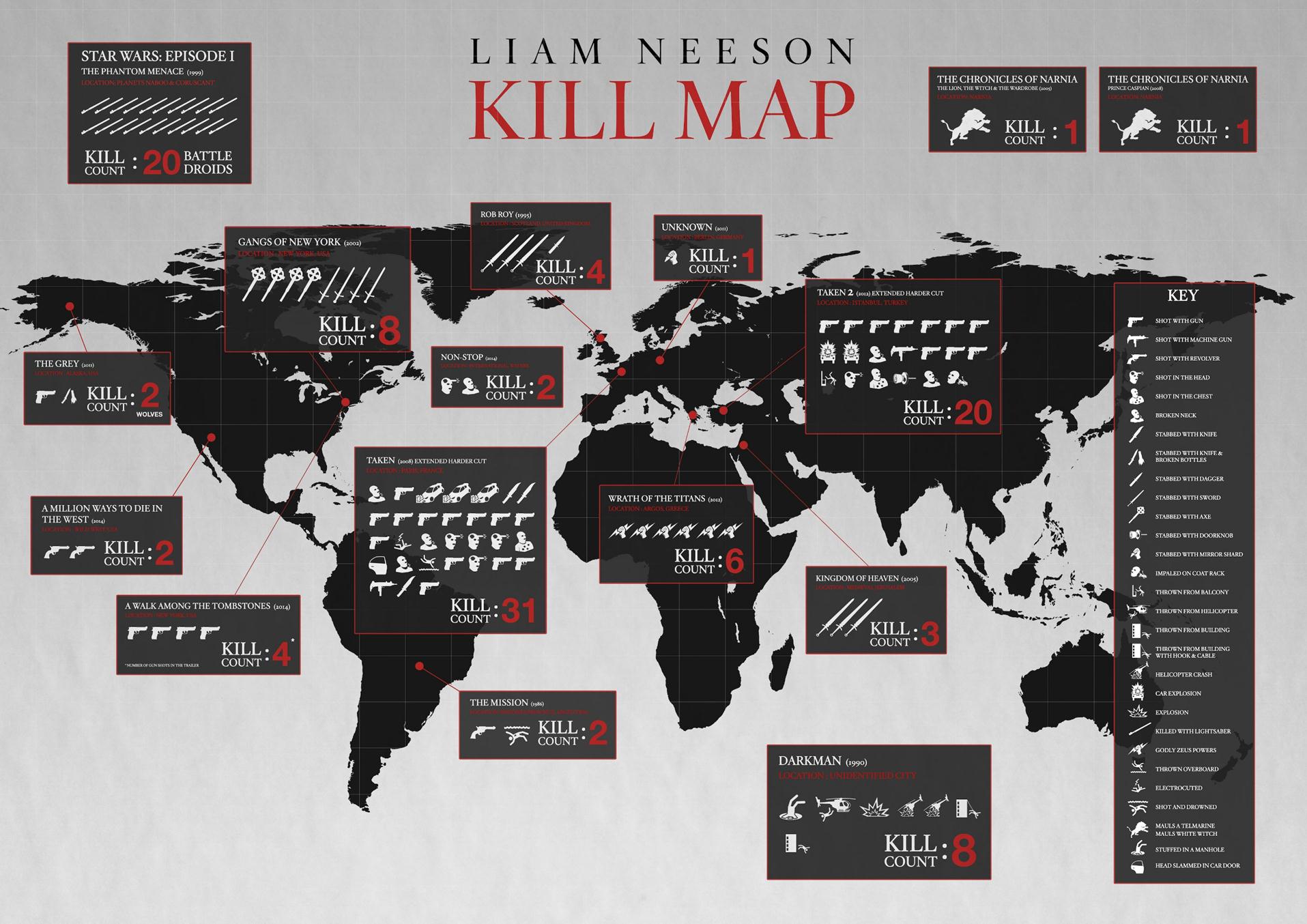 When I came across this, it seemed just too good not to post. The good people at collider posted the Liam Neeson kill map recently. While I’m not sure who the artist that created it is, whoever he or she may be put a fair amount of time and research into this project. The map not only shows the number of kills per country and movie, but it also goes so far as to list the weapon and manner of killing. To whoever created this, my hat is off to you. Click on the picture to see the full sized version.